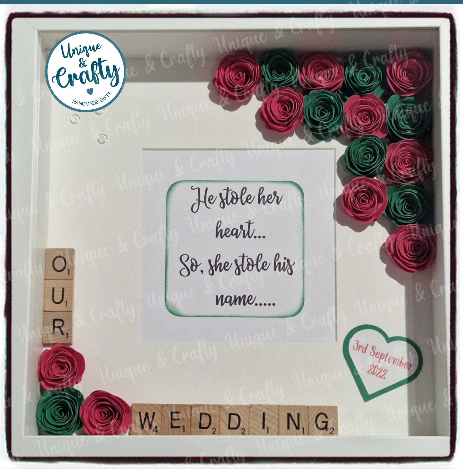 I design and make up these frames myself. Using Ikea box frames and adding a handful of paper flowers and a few letter tiles, to create the perfect keep sake